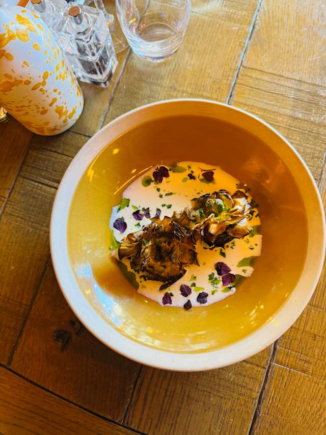 - Œuf poché, crème d'artichaut, poireau rôti, velouté de topinambour à la truffe