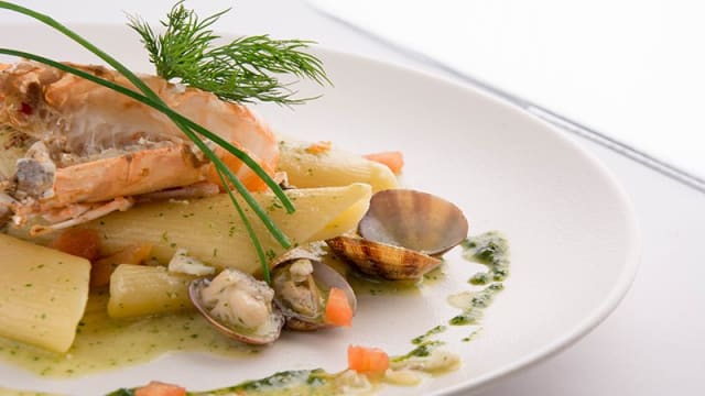 - Tagliolini, pomodoro, stracciatella, gambero rosso e basilico