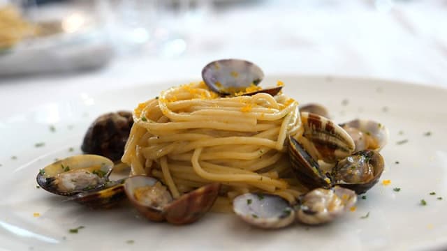 - Spaghettone alle vongole veraci, olio di prezzemolo, zeste di limone fermentato