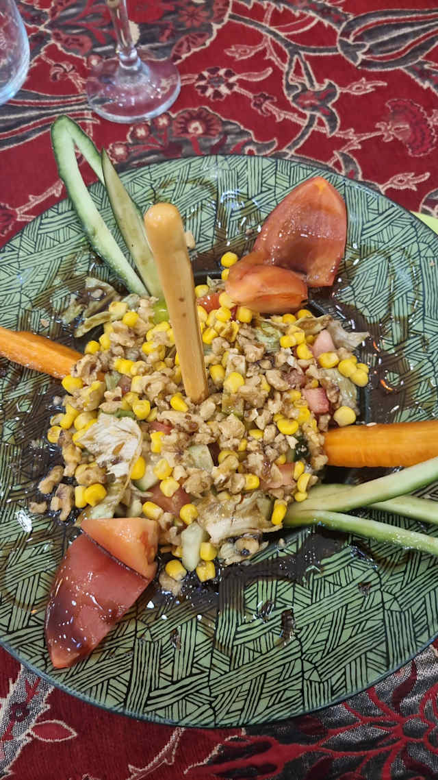 - Mix di carne di vitello e pollo con sugo al pomodoro e zucchine, melanzane, funghi e pomodorioro, cotti all'interno de coccio che esce in fiamme e viene rotto dallo chef davanti a voi e versato al tegamino. Riso affianco.