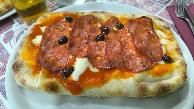 - Pomodoro, mozzarella, salame piccante, olive taggiasche