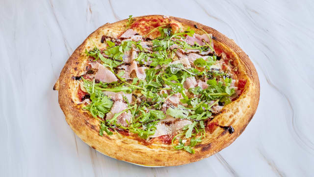 Salade romaine, roquette, mozzarella fior di latte, légumes au four, jambon cru, olives noires, basilic, pain fait maison