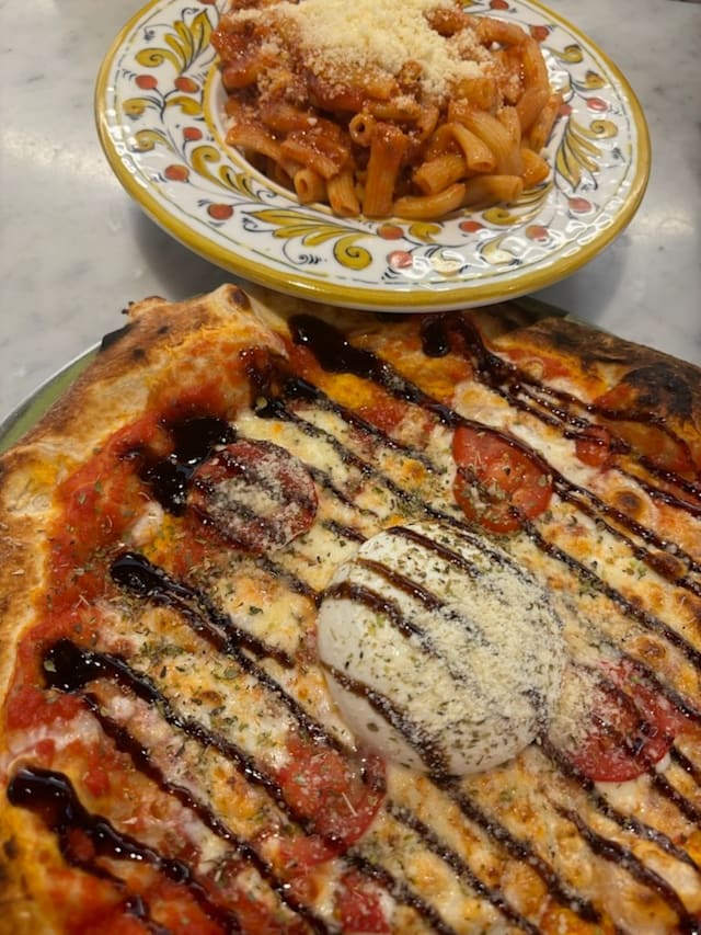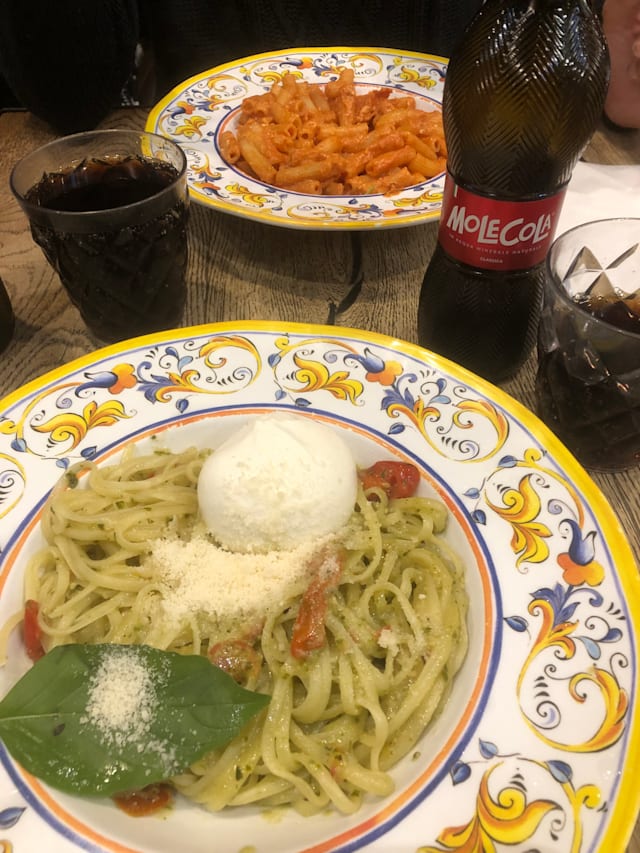 Pâtes fraîches, salade romaine, tomates fraîches, tapenade de tomates, stracciatella, huile d’olive au pesto de basilic, basilic, pain fait maison