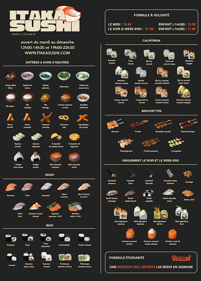 Yes, Itaka Sushi a Volonté is offering 20% off the 'a la carte' menu Reserve your table and enjoy your special discount now on TheFork!