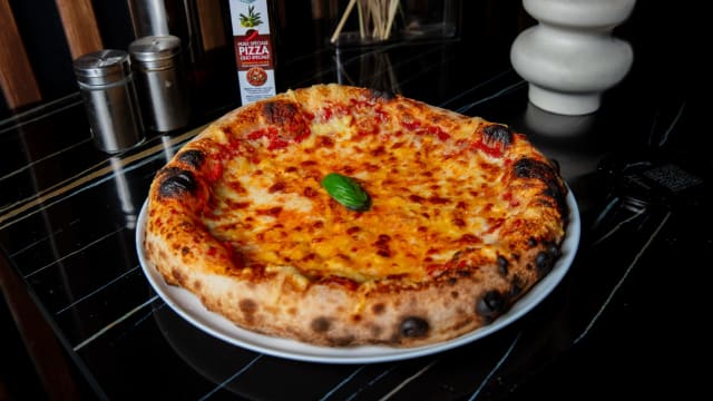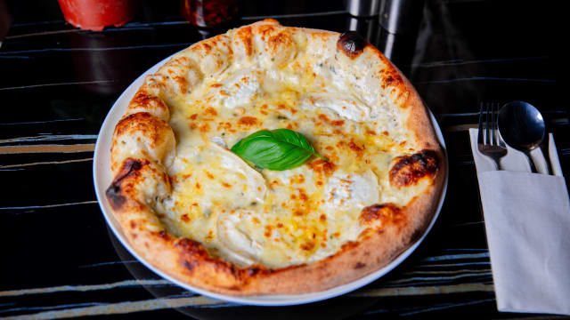 Base tomate ou crème, roquette, tomates cerises, burrata à la truffe, pesto maison, parmesan