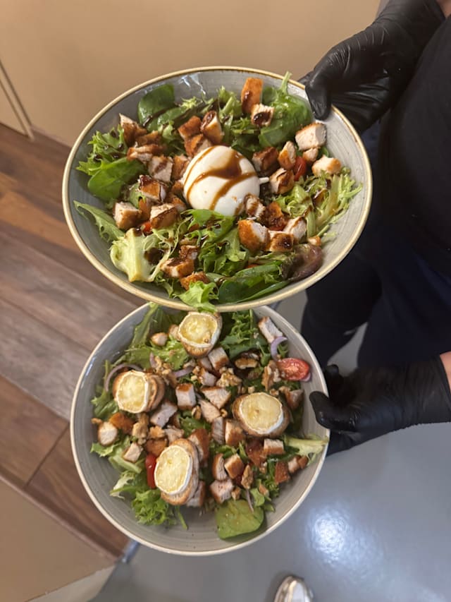 Salade verte, tomates, toast de chêvre chaud, oignons, noix, miel