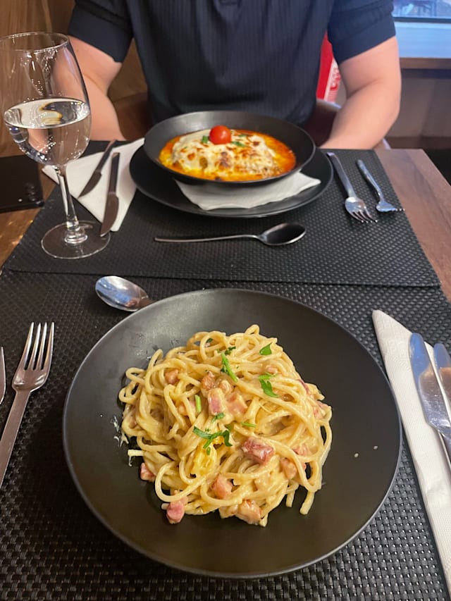 4/10Food of bad quality. I asked for a Carbonara and I could sense the taste of burnt bacon on my spaghetti.