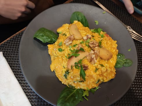 8/10Service and location is excellent, food was good- not amazing. Avoid spinach soup by all means as it not very good( lack of salt, tasted rather disgusting). Had caesar salad - was good! Staff was attentive and it was quite a nice decor. Besides the soup- rest was ok!