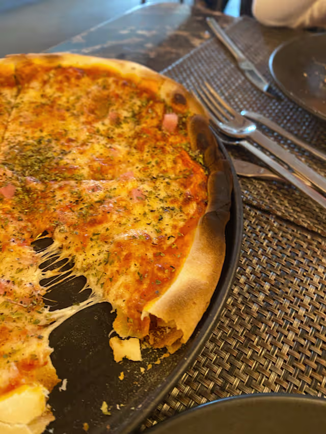 - Base de azeite e alho, tomate, queijo mozzarella, carne picada e orégãos
