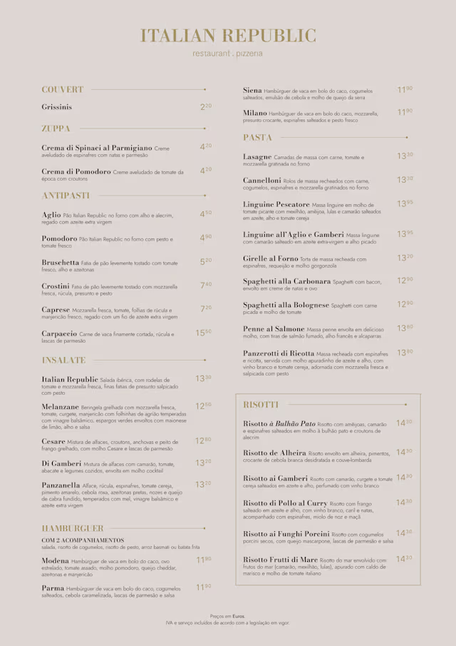 I really enjoyed my experience at Italian Republic in Guia. The food is tasty and well-served, especially the thin-crust pizzas and the risotto, which were spot on. The atmosphere is modern and pleasant, and the service was attentive, making for a very relaxed lunch. It’s an excellent spot for a quality meal at a fair price; only a few small details regarding the waiting time prevented a perfect score, but I will definitely be back!
