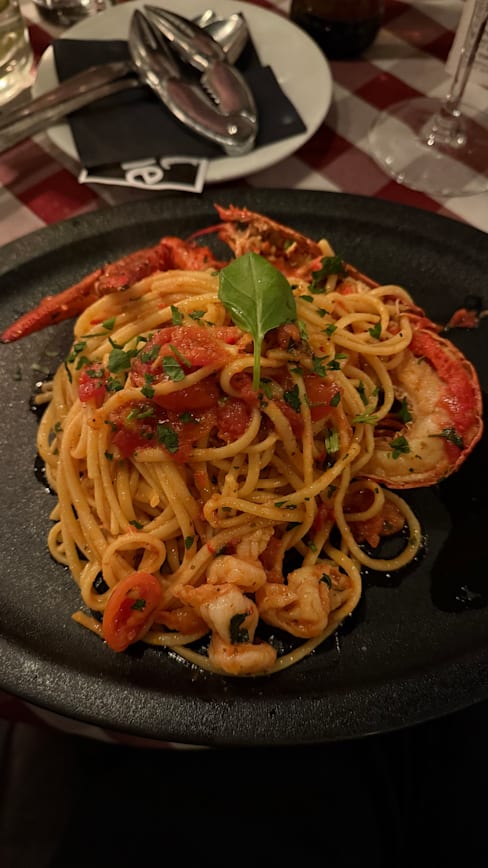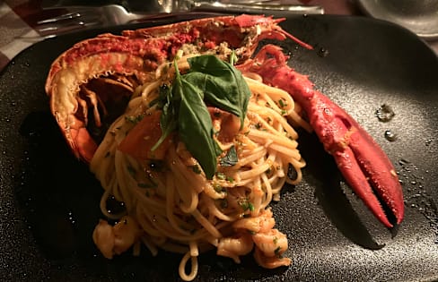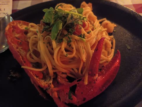 6.5/10We got there about 15 min lat, because we could not find any parking slot available on a Sunday evening (note the area is very different to find parkings. When we arrived and explained why we were late, the waitress didn't mind our late arrival, which was very nice of her. I ordered a pasta with a half lobster and scampi which turned out being a disappointment: The lobster was too salty and precooked, and the scampis were small like shrimps.