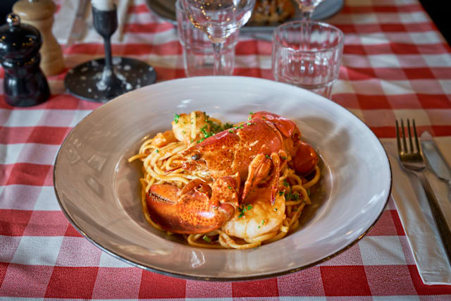 - Pasta med halv hummer, scampi, vitlök, pepperoncino, vitvin och körsbärstomater i hummersås