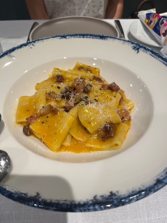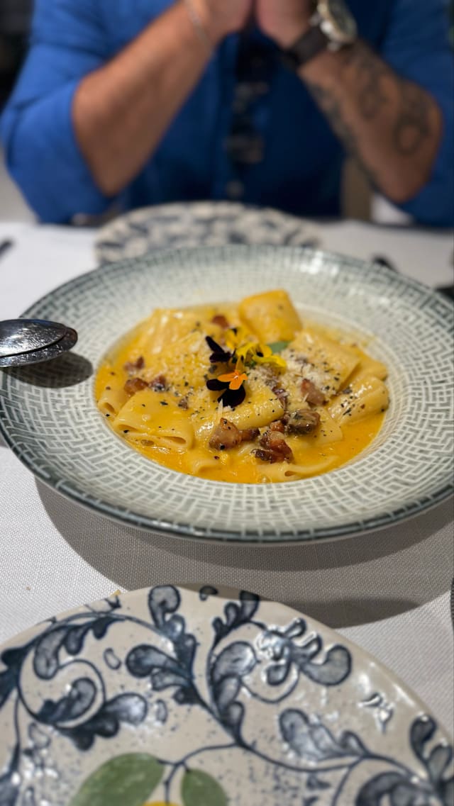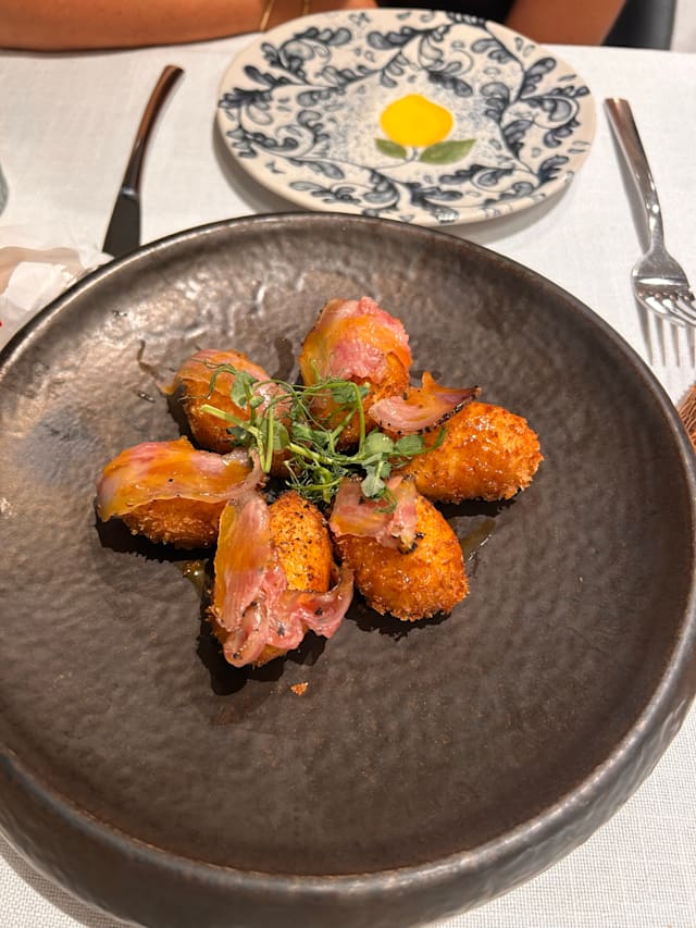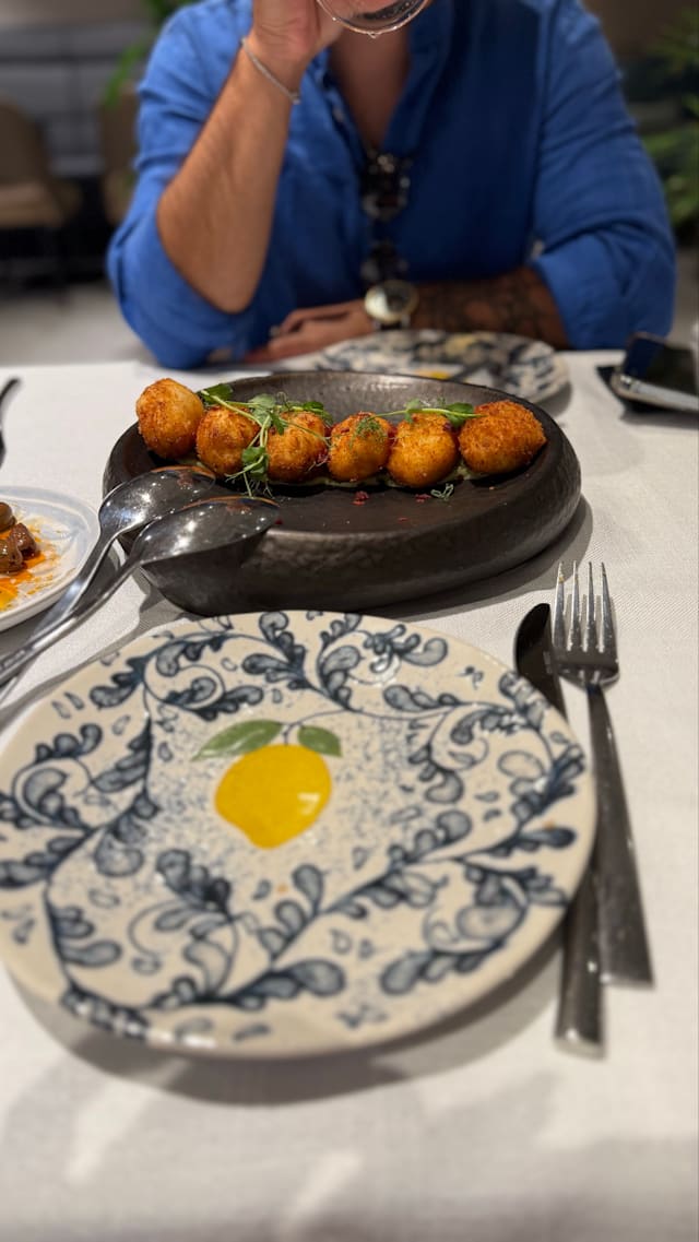 9.5/10Excelent food and service, though the ambient was a bit... bland. There was a special chorizo croquette that was incredible. The pacheri carbonara was also very good.