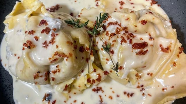 Capelacci de langosta y gambas con crema de foie y parmesano