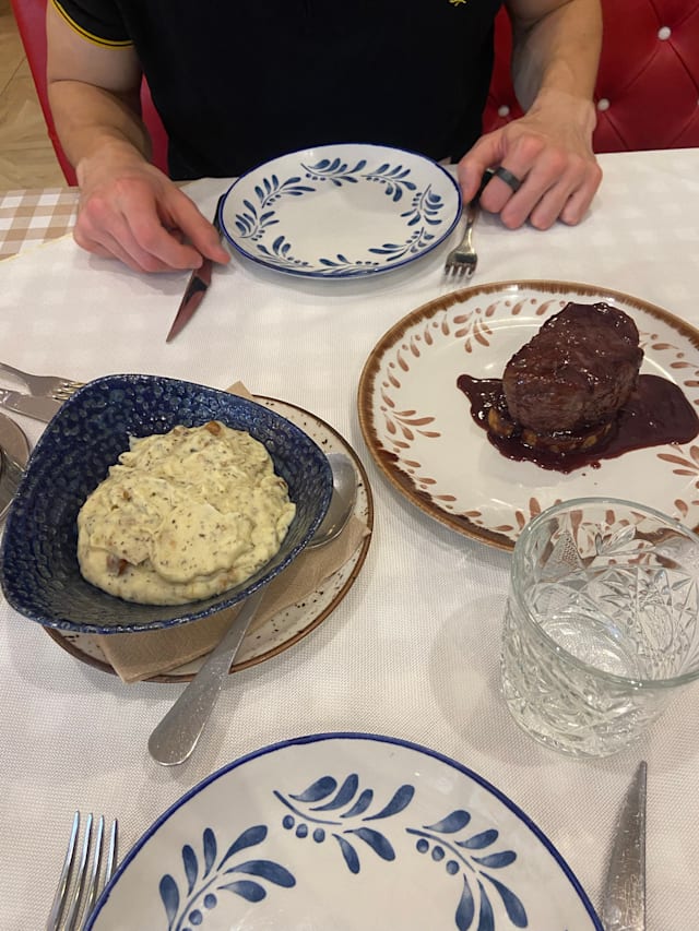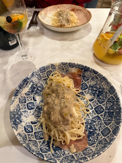 8.5/10The starter was really good. We had the Tagliere Romano and it was quite good. Diverse and tasty. Both of us had the pasta alla forma, decent portion but lacked just a touch of salt. We also both drank the champagne sangria and it was really good and refreshing! For desert we had the tiramisu (really great) and the semifreddo al torroncino (was okay) Price was in line what the usual practice in downtown Lisbon.