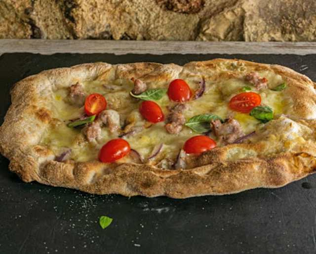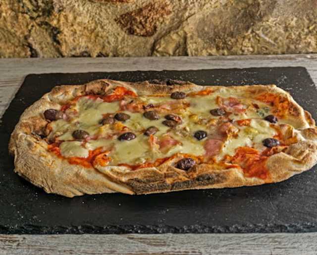 - Tomate, mozzarella, gorgonzola, guanciale y aceitunas rojas.