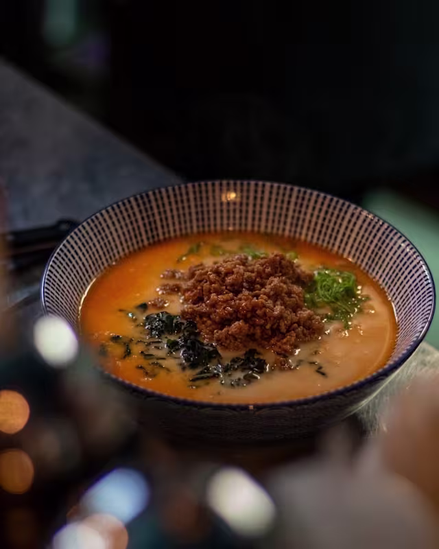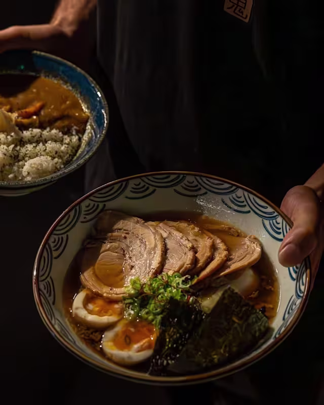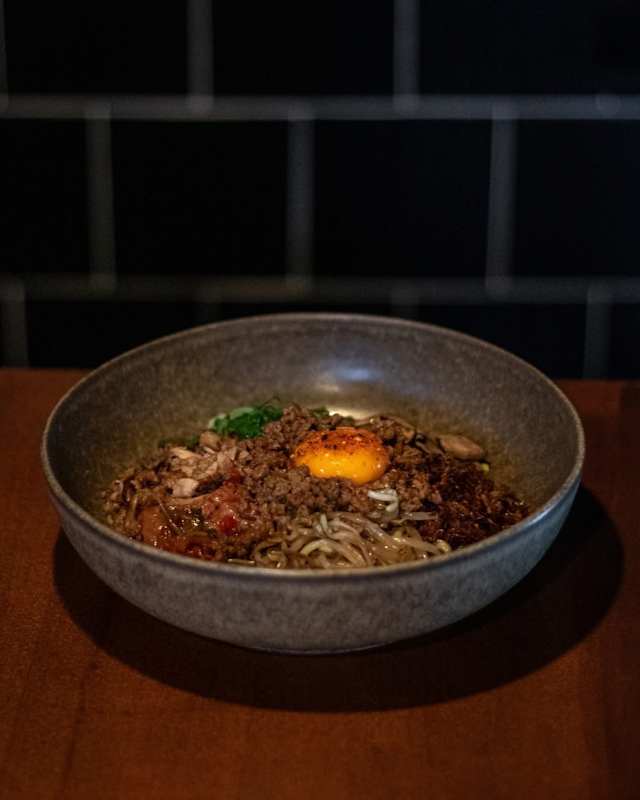 - Toppings: cebolinho, cebola frita, cogumelos, kimchi, carne de porco picada, rebentos de soja e gema de ovo
