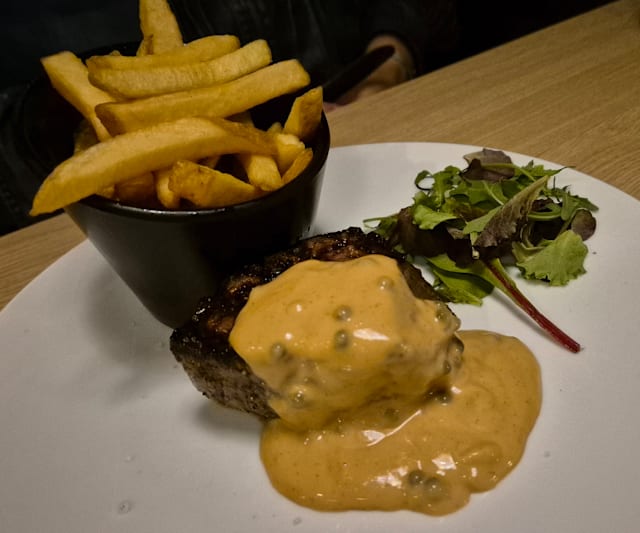 7/10We ordered two steaks for main course, both medium but one is obviously over medium and another one is obviously rare than medium. But the food overall was okay. Service was good, the stuff was friendly. What makes us feel not too comfortable was, part of the restaurant’s dining area has the light off which seems not welcoming(and there was no one at the reception desk).