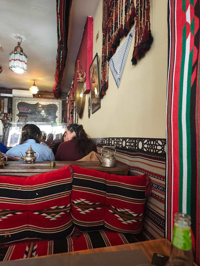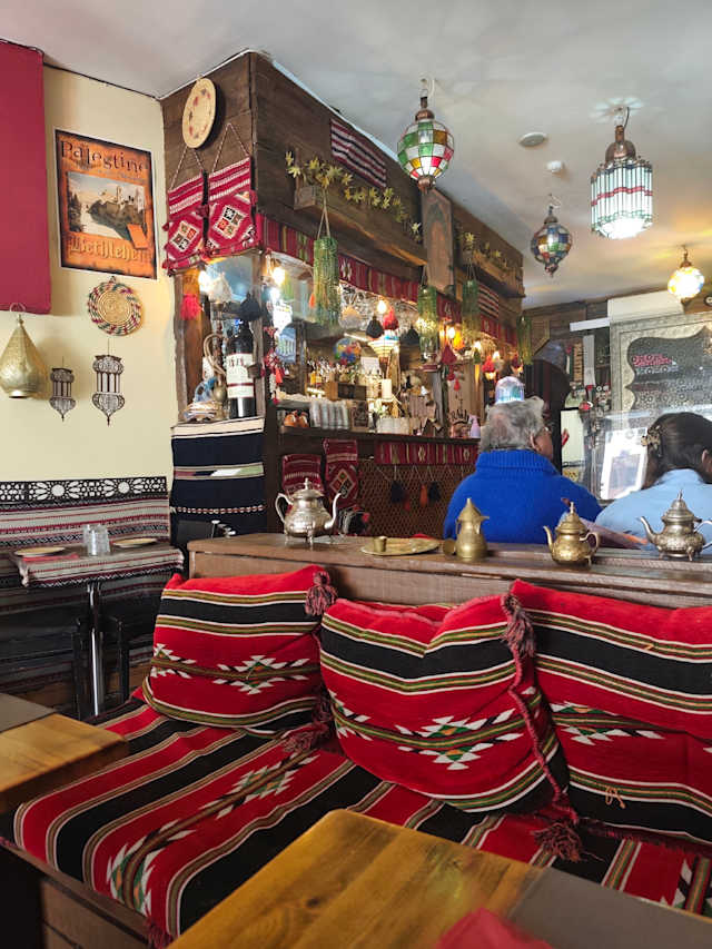8/10The restaurant hosts a really nice interior taking us back to our memories from our trip to Morroco, the cuisine is Palestinian and the quick bites were really designed well, it was a little disappointing that they run out of aubergines in mid day of a Sunday heavy rush game night (like they did not forecast their sales and orders well), but all of the dishes we ordered were well done and tasted good. The only thing to improve would be faster service when the cheque needs to be given at the end of your meal so your not left hanging.