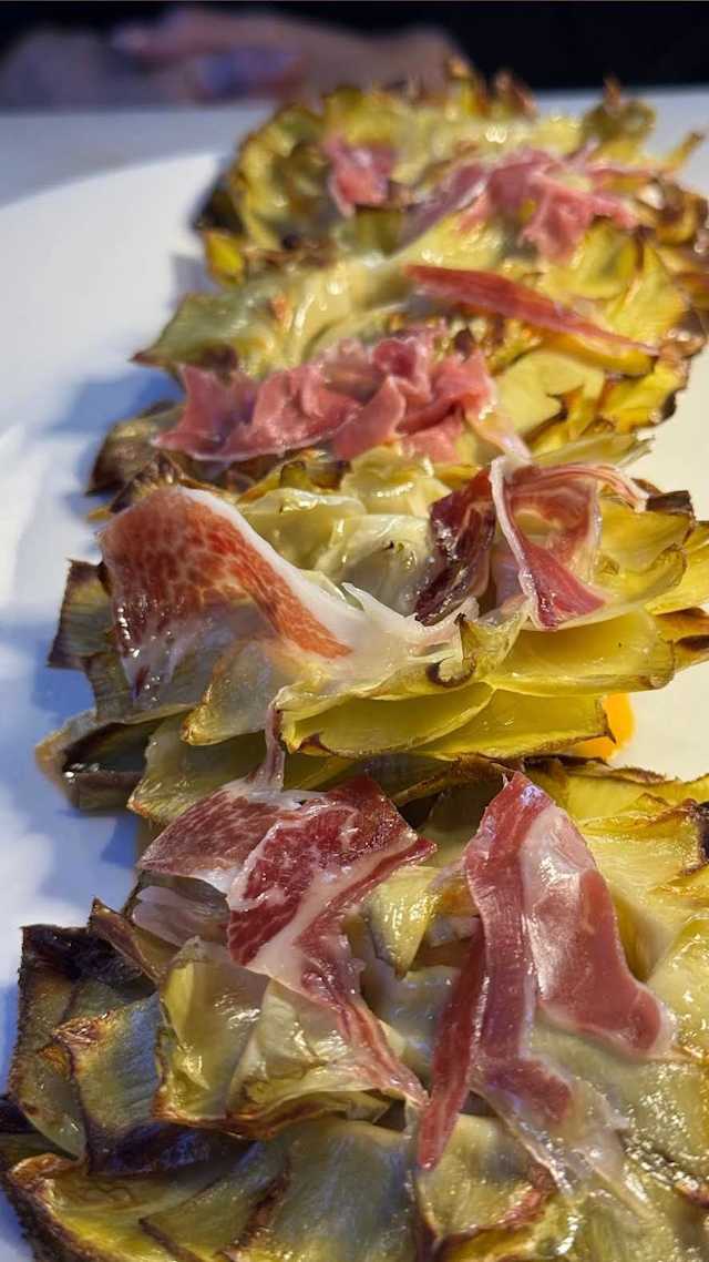 - De tortilla francesa con tomate natural y lascas de jamon iberico