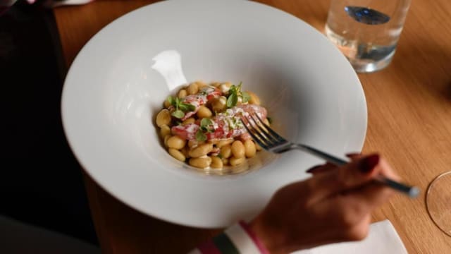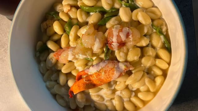 Gnocchetti di patata mantecato con ricotta di pecora e salsa di cozze alla brace, olio di peperoncini verdi alla brace, pomodoro alla vaniglia