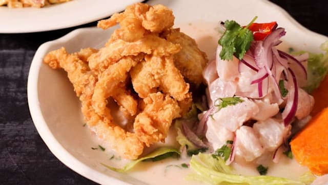 Patata prensada con ají escabeche y relleno de pollo, aguacate, verduras y mayonesa de casa acompañado de ceviche de pescado