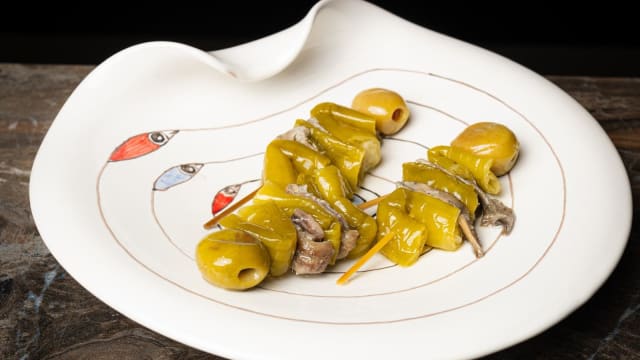 Spiedino con oliva verde ripiena di peperone, peperoncini dolci e acciughe del cantabrico