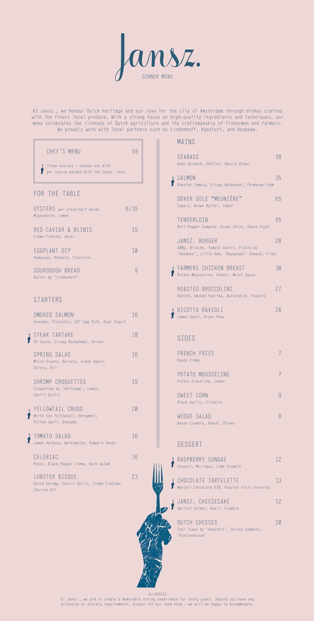 We ate at Jansz a year ago. It was I best meal we ate in our 2 weeks in Amsterdam. Tonight it was awful. My wife ordered the sole. Same as she did last year except there was no salad with it or vegetable. It was completely tasteless and there was a tremendous amount of oil on the plate. For 65 euros that is ludicrous! My sea bass was also very mediocre. The spinach was soggy and drenched in a terrible sauce. No bread was served until I asked for some. It was one of the worst meals we had this year in Amsterdam.
