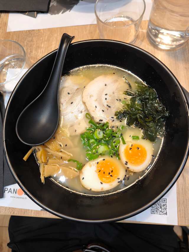 - 2 Tranches de yakibuta (porc chashu), sauce shoyu originale, bouillon de porc, nouilles ra-men maison, shinachiku, œuf mollet mariné, algues nori, cébette