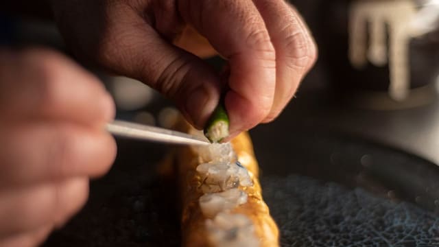 Carpaccio di pescato del giorno 8pz con olio al tartufo, erba cipollina, tobiko e kataifi