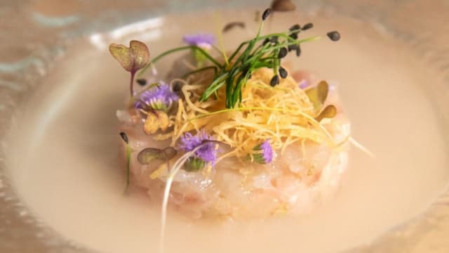 Con tartare di tonno, insalata, pomodorino e crema di pistacchio