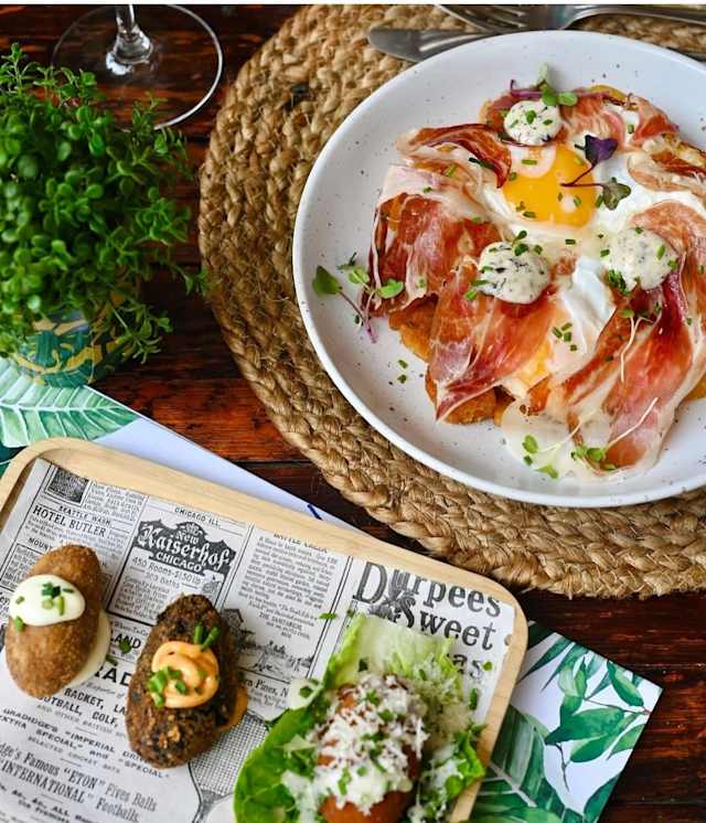 - Con jamón ibérico, patatas caseras y emulsión de trufas