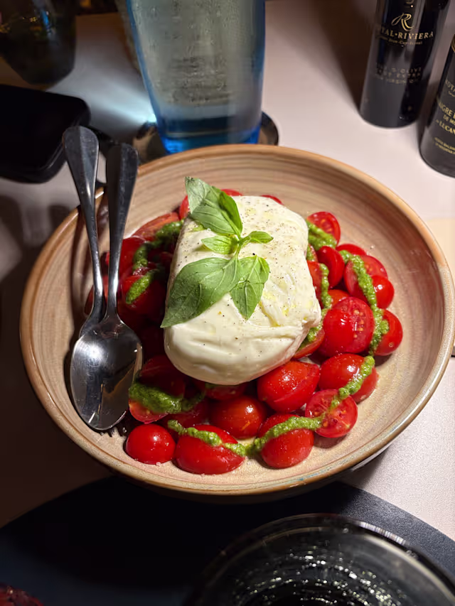 - Burrata della Puglia, tomate, huile d’olive vierge, basilic, pesto
