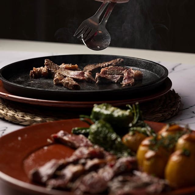 Con patatas y pimientos del padrón. Servicio de piedra caliente para terminar en mesa.