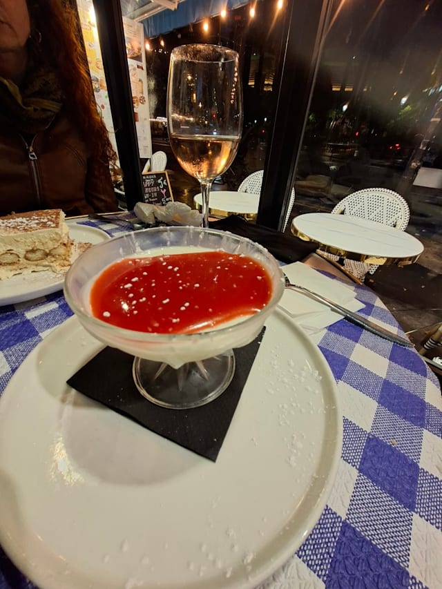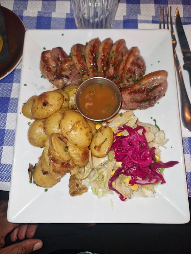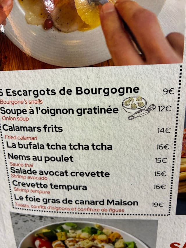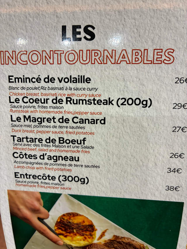 10/10This was our second visit to this restaurant. There were visibly less guests this time. We tried things on the menu which were ok but do not recommend. The French onion soup was too thick and also lacking onions. It did vibe with a bay leaf and sprinkled with chives but no thyme flavor. Too little cheese on top. My partner had the calamari which were overly breaded and basically carbs surrounding a small squid ring. But the accompanying salad was nice. Again do not recommend. The star if the meal was the wine and meat. My entrecôte came flaming and was delicious and perfectly cooked. The fries were crispy as requested. My partner had the delicious veal Norman which came with a cream sauce. It was perfectly cooked and they allowed him to change the carb from fries to basmati rice. We came here in January and now ok July the good quality is still good. Order carefully and remember that French expect food differently than Americans. The 50 cl cote de Rhône was great.