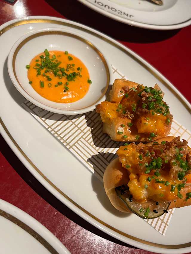 - Gunkan de wagyu braseado, kizami wasabi, maionese de kimchi e tártaro de carabineiro