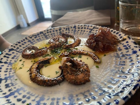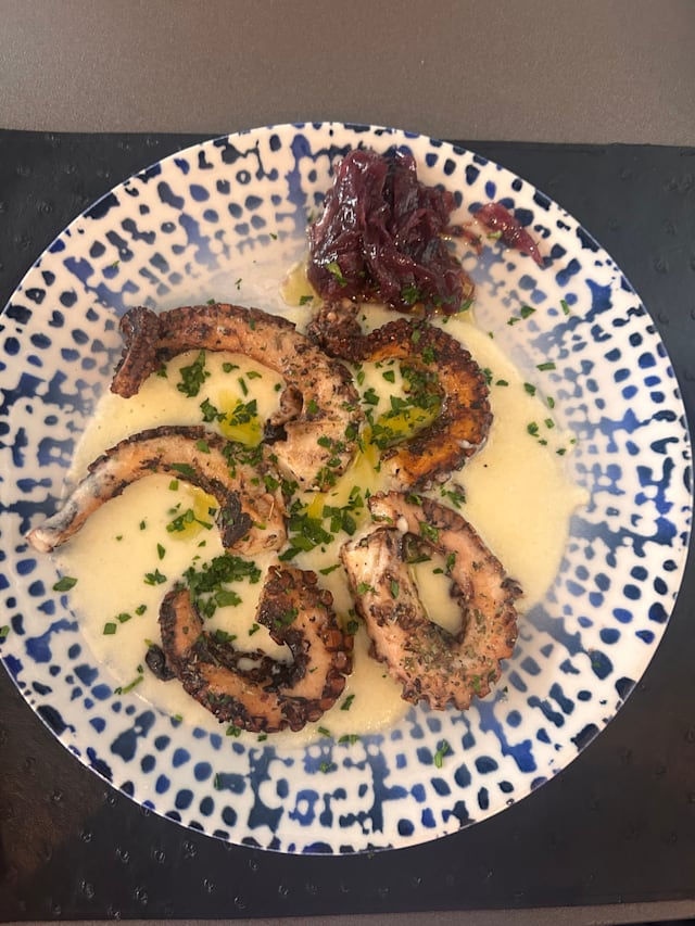 10/10Absolutely delicious warm starter of octopus with tomatoes, capers, olives then a superb dish of roasted sea bass with toasted almonds and pesto. Great wine too and very welcoming people, thank you!