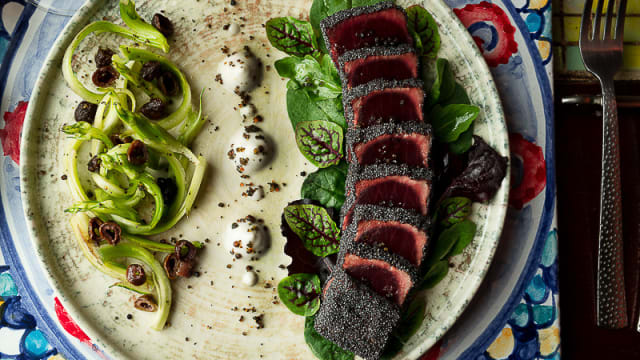 Caponatina mediterranea di verdure con pesce spada siciliano, pinoli tostati e maionese alla menta