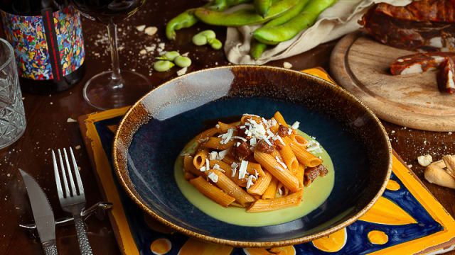 Mezzi paccheri di grano duro del pastificio agricolo mancini, polpette di wagyu, pomodoro san marzano pugliese mantecato e scaglie di cacio ricotta della masseria il carro