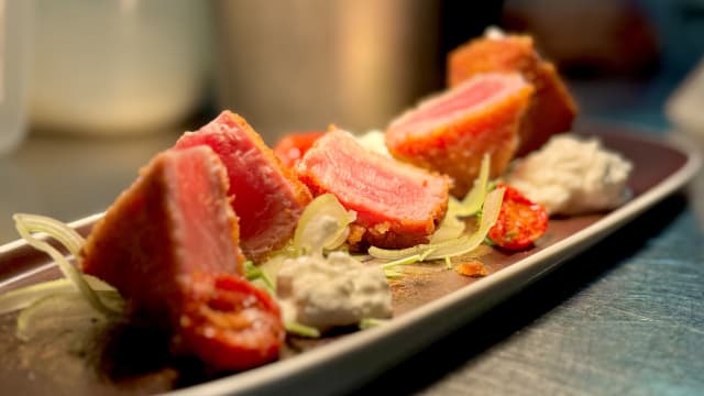 Tonno in crosta di frisella, stracciatella e cipolla caramellata