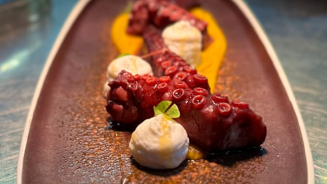 Polpo in doppia cottura, zucca, sponzale e dripping al Primitivo