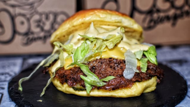 Doble Carne Smash y doble cheddar americano, cebolla fresca, pepinillos Joey's, kétchup /mostaza en pan brioche.