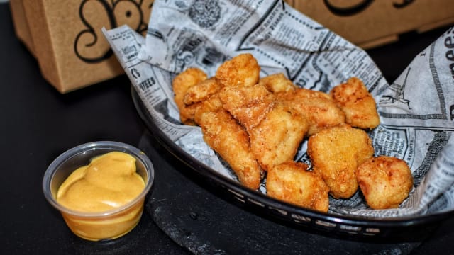Pollo macerado en salmuera 24h, rebozado y frito ultracrujiente, acompañado de salsa Fil-Lynn.