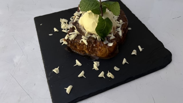 Torrija de chocolate casero hecho al momento , con una bola de helado de vainilla y virutas de chocolate blanco.