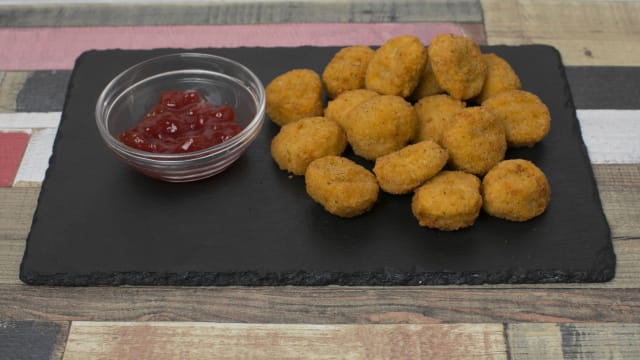 Pan brioche (juanito Baker), pollo crujiente al estilo kentucky, canónigos, tomate, cebolla crujiente, bacon, queso gouda y salsa cheddar. Acompañada de patatas fritas caseras
