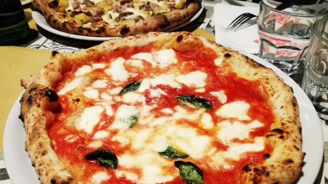 Crema di pistacchio, mozzarella, granella di pistacchio, mortadella, basilico, scaglie di parmigiano grana padano ed olio EVO