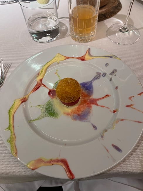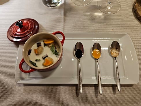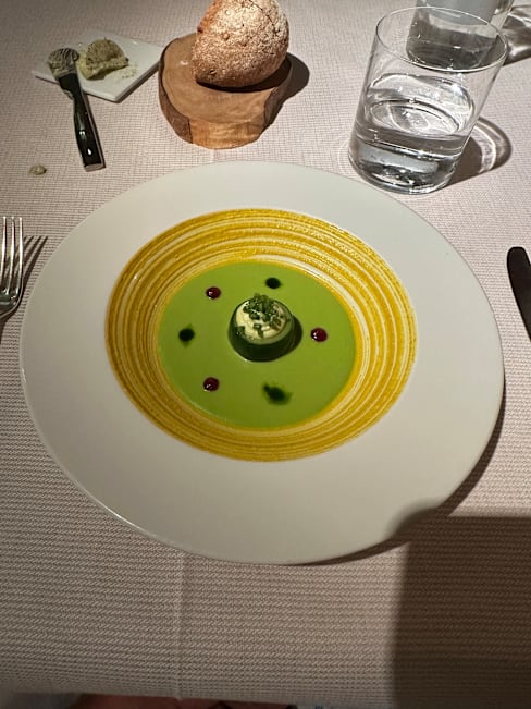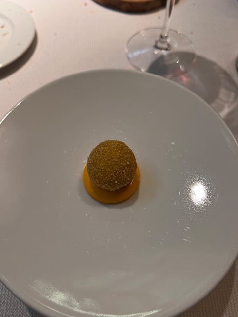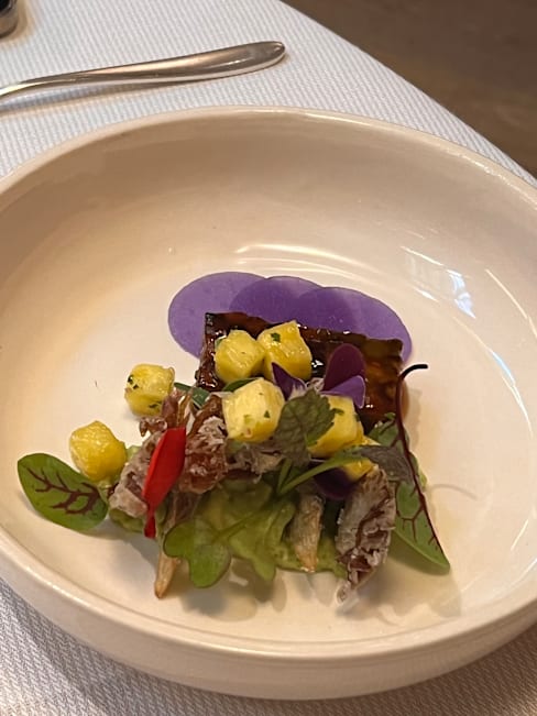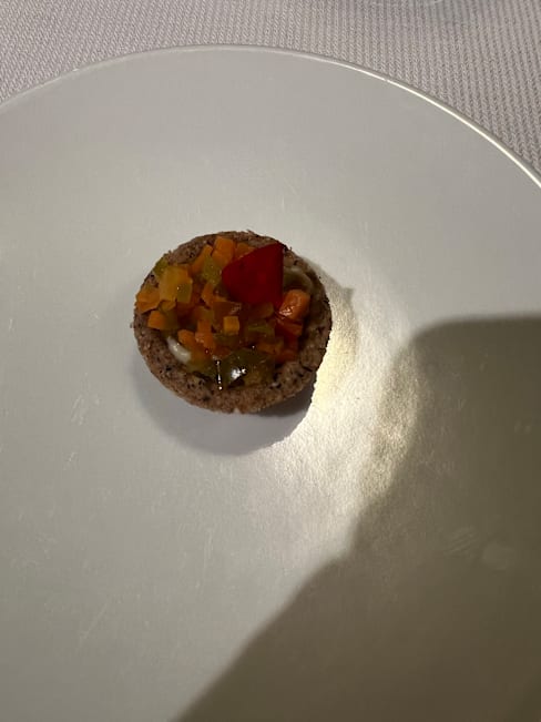 8.5/10+9The staff were welcoming but as my reservation was at 12:30 I was surprised the doors were still locked and it took them a few moments to unlock them (at 12:30). As a courtesy to the restaurant I didn’t want to be late but they were likely not used to someone showing up right as they open. The staff were welcoming and their English was good. They were serious and did not do much small talk. Perhaps it was a language issue so not a significant criticism. I appreciated them going over all the items but wish they had spent more time explaining the ingredients, the reasons for the pairings, and the overall themes. The only example they offered was that one of the cheeses was from the chef’s hometown. Under a colorful blanket was my favorite - mystical presentation and many interesting flavors and textures. I thought in the morning before sunrise was rather bland - a missed opportunity with a dal curry. The navel of the world was skipped because I had left a comment that I didn’t like mushrooms. I was disappointed this wasn’t replaced with another dish. The law of chance also stood out as being a nice mixture of textures and flavors and I appreciated the server prepping it in front of me. The golden volcano looked nice but the flavors seemed redundant. I don’t have a sweet tooth but perhaps having something sweet along with the tartness of the apple would’ve been nice. The mango ice cream was nice and neutral - more of a palate cleanser than an accompaniment to the apple/fruity volcano. An opportunity to see the chef, even briefly, would have been very welcome. Overall I’ll come back as I appreciate the creativity, vegetarian options, and commitment to sustainability. Bravo.