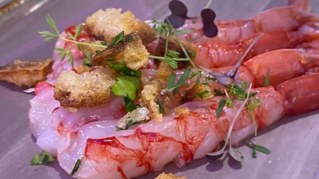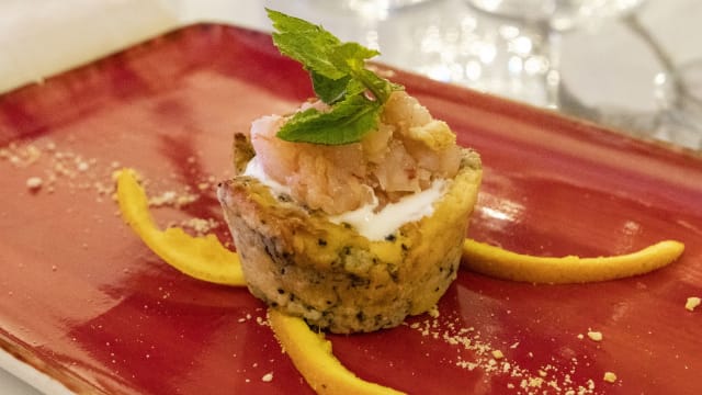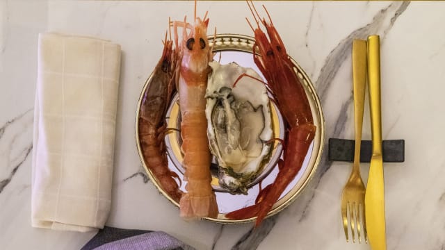 Cavial master 10g., 2 ostriche belon, 2 gillardeau, 4 gamberi rossi mazara del vallo, 4 gamberi viola di ponza 2 gamberi carabineros della galizia, 4 scampi jambo di ponza e crostini artigianali con acciughe del cantabrico e burro di normandia.