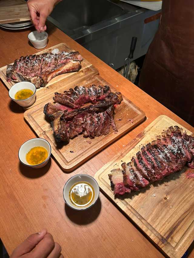 - Carpaccio de wagyu marinado com molho de soja, vinagre de arroz e molho de ostras