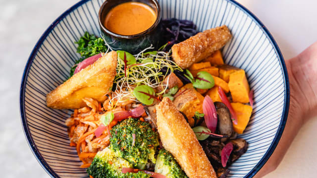Crispy tofu de la ferme des petits evaurys, légumes cuits, crus et fermentés judy, sauce satay amande, riz basmati semi-complet infusé à la noix de coco